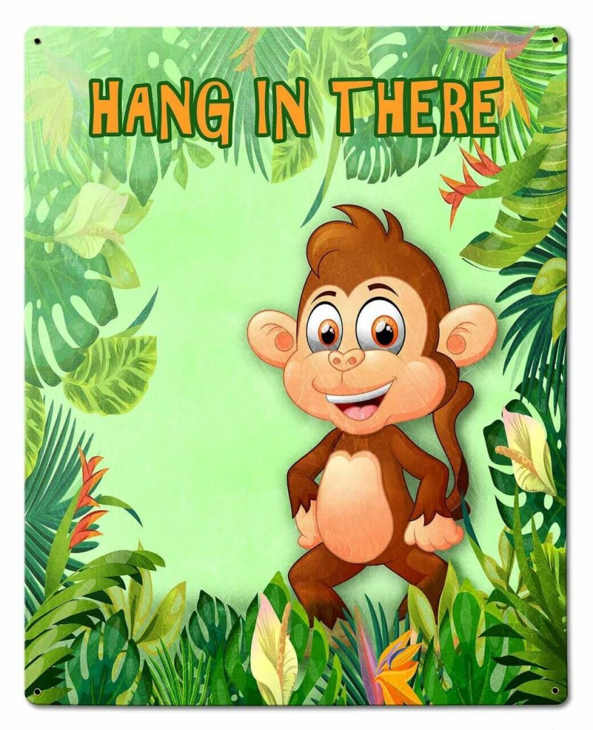 The friendly monkey illustration paired with the classic “Hang In There” message makes this sign both motivational and fun.