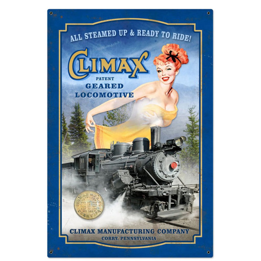 Inspired by advertising of the Climax Manufacturing Company, the imagery pairs a classic steam locomotive with retro pin-up art and bold typography. This makes the sign: