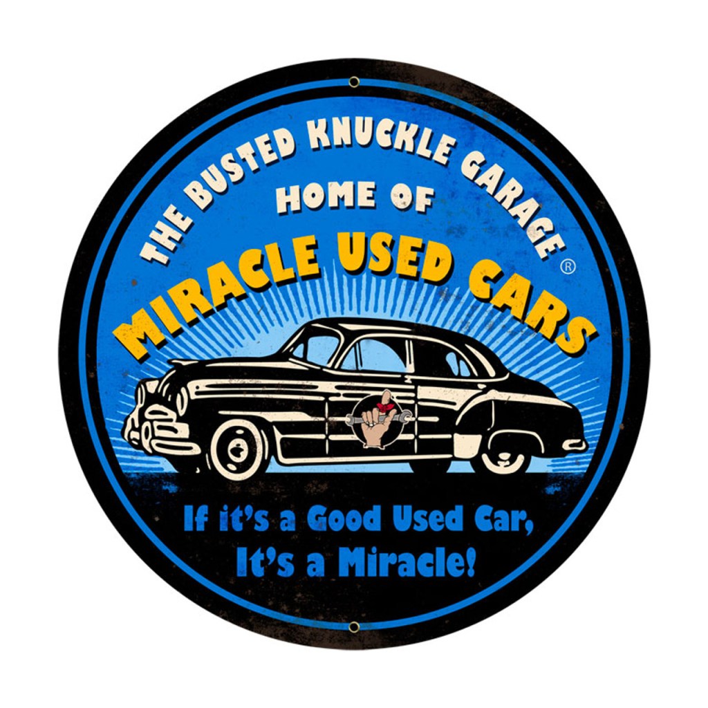 The βMiracle Used Carsβ aesthetic taps into classic motor-industry, used-car lot signage β a design language rich in nostalgia and Americana. This sign works well for:
