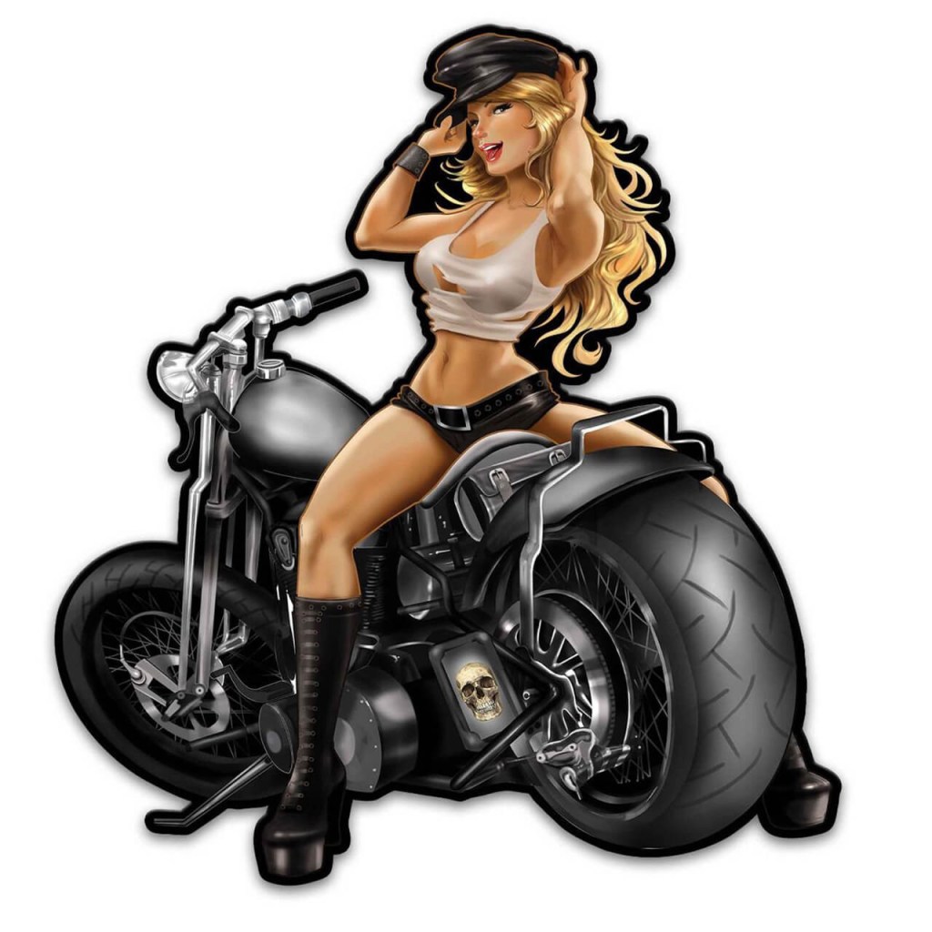 - 🎨 Theme with attitude – Featuring a motorcycle-girl pin-up motif, this sign taps into vintage biker aesthetic, making it more than decoration—it’s identity.