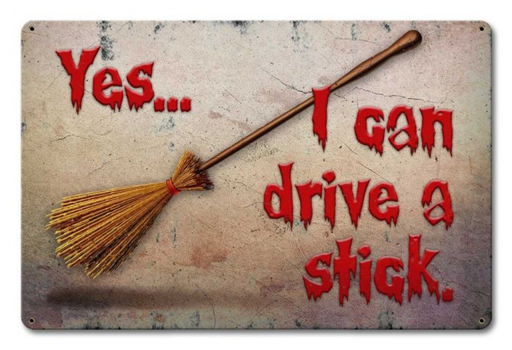 - “I Can Drive A Stick Metal Sign (18″×12″)” – delivers a wink with a broom-stick twist.